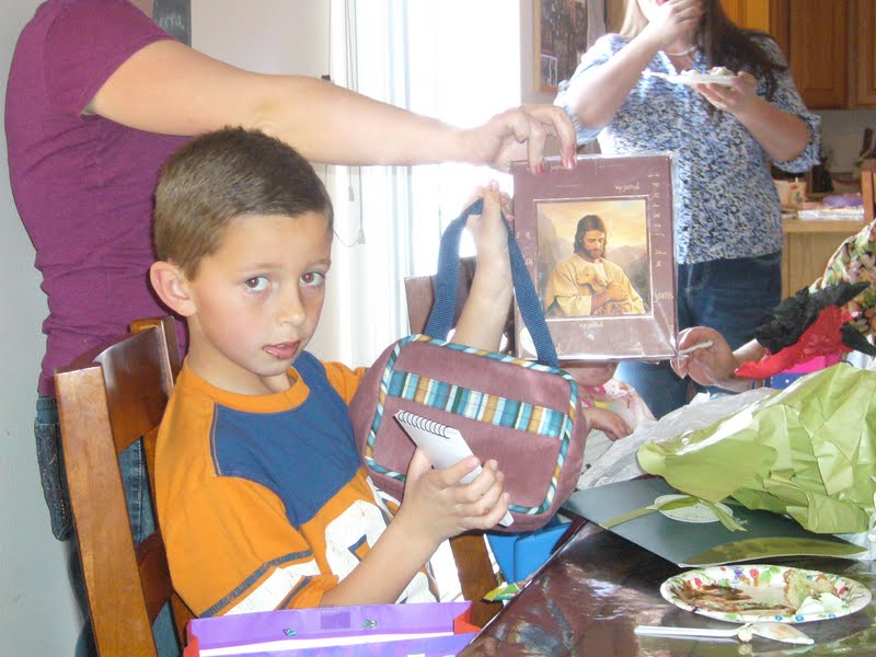 Amelie and I got up and started getting Carson's cakes ready and then Carson's Baptism was early afternoon. Steve baptized Carson and Aunt Martha gave the talk, Grandma's gave the prayers, Aunt Christine and Aunt Olivia did the music, and Grandpa Confirmed Carson. We had a great turn out of family and friends. Thanks to all who helped make Carson's special day even more special!! After the baptism we all came back to our house for cake and ice cream!! Later in the evening we had the group picture taken by a friend and he was amazing he was holding three cameras at once and managed to get a few pictures with everyone looking at the camera!!
